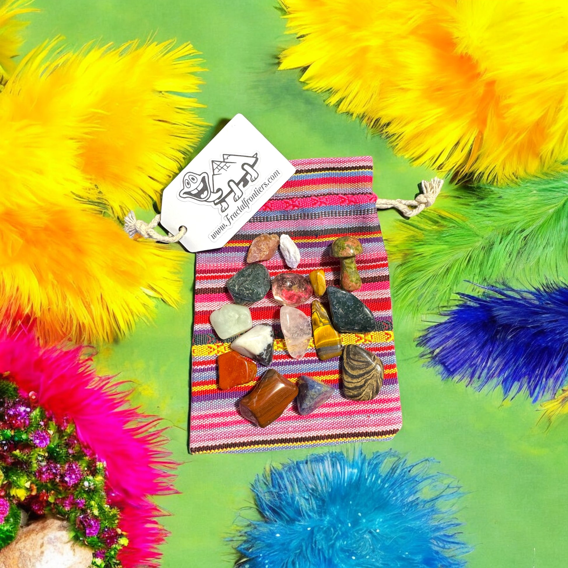 This hand-selected gemstone set is more than a collection—it’s a conversation between Earth and starlight. Nestled in a vibrant woven pouch, each stone is a whisper from deep time, shaped by elemental forces and gathered with intention. From grounding jaspers to calming aventurines and illuminating quartz, every piece holds a frequency waiting to resonate with your journey.
